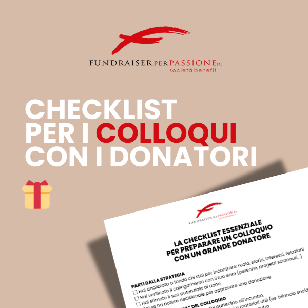 Sei riuscito ad ottenere un colloquio con un potenziale donatore? Non lasciare spazio all’improvvisazione. Abbiamo preparato una checklist essenziale per verificare tutto: strategia, materiali, richieste e follow-up. Una pagina da tenere sempre a portata di mano prima di incontrare un grande donatore. Scaricala gratis e usala subito.offerto da