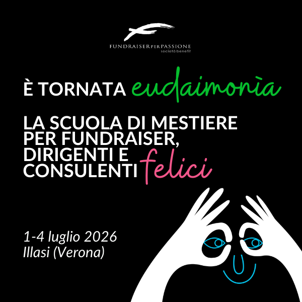 È tornata Eudaimonia: quattro giorni immersivi per lavorare sul mestiere del fundraising, sulla guida degli enti non profit e sulla crescita professionale. Non un convegno, ma una scuola di mestiere, con casi, confronto e strumenti applicabili. 1–4 luglio 2026, in una splendida location tra le colline veronesi. Se vuoi fare un salto di qualità nel tuo ruolo, questo è il momento di candidarti.offerto da