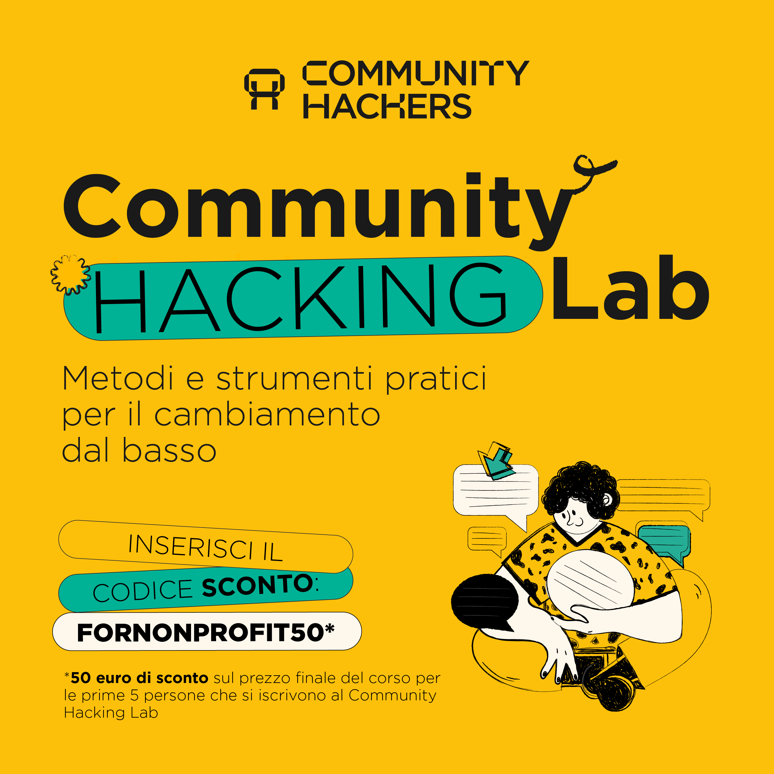 Community Hacking Lab è un percorso di 6 settimane per acquisire metodi e strumenti pratici per l'innovazione dal basso. Per la rete For Non Profit abbiamo riservato un’agevolazione esclusiva. Usando il codice FORNONPROFIT50 entro il 27/02 sarà possibile avere 50€ di sconto sulla quota d'iscrizione (pass singolo).offerto da